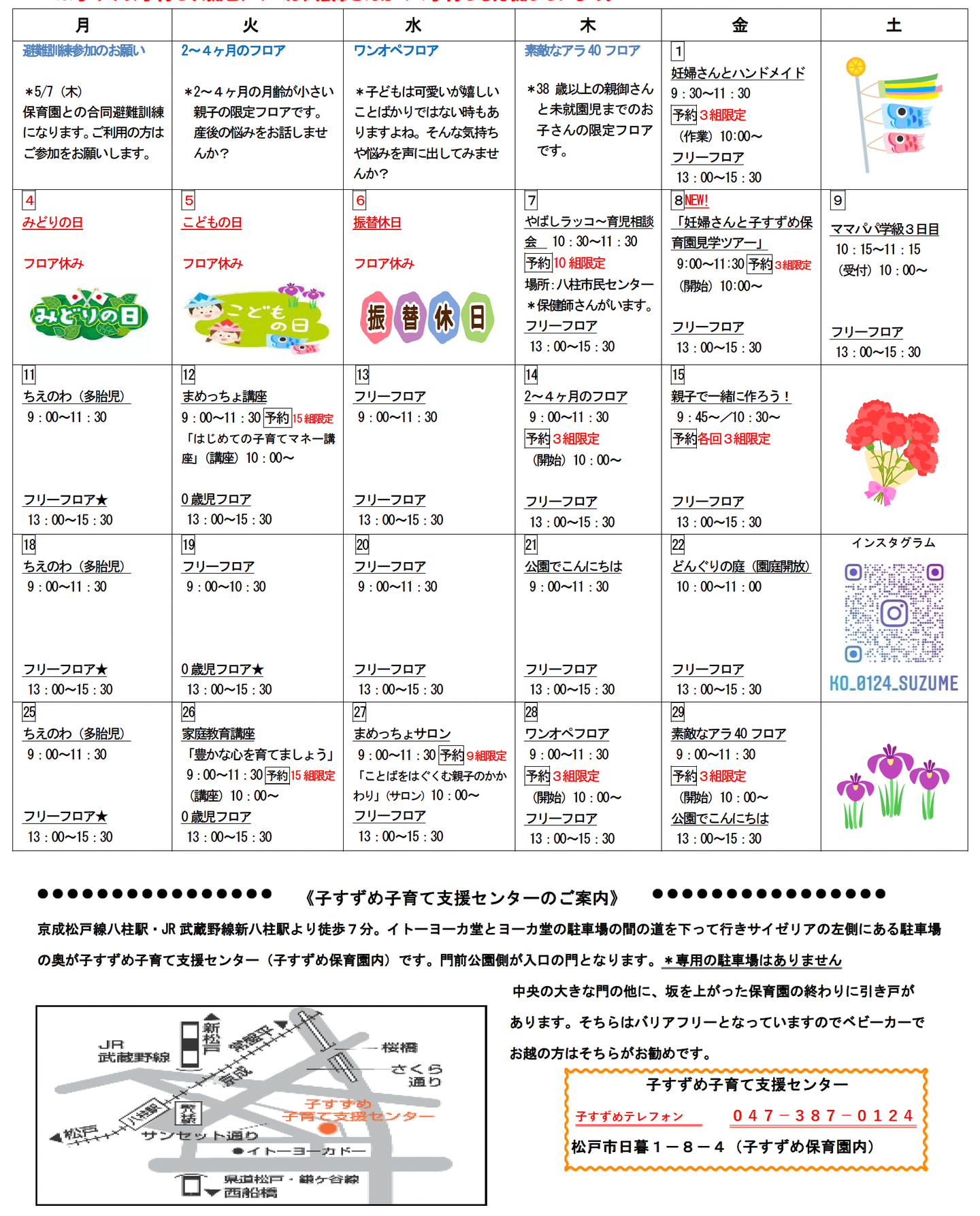 新緑がまぶしい季節となりました。外を歩くと心地よい風が吹き、親子でお散歩するのも気持ちよい時期ですね。今月も親子で楽しく過ごせる時間を用意して、みなさんをお待ちしています。